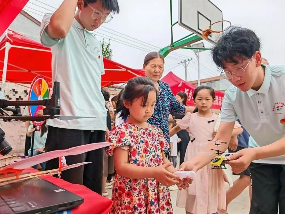 实践团队通过拆解无人机结构讲解飞行原理,细心指导小朋友操控电动直升机完成起降。