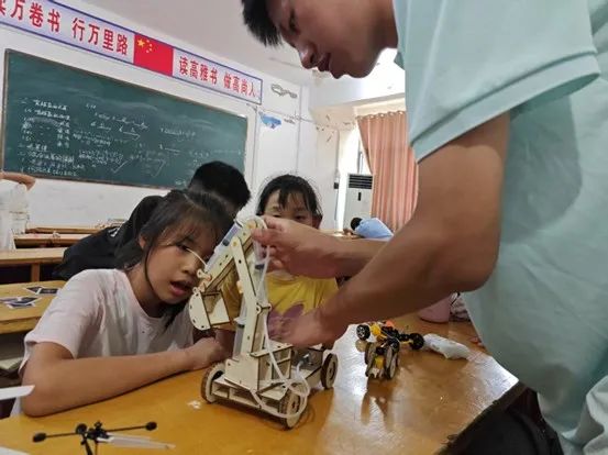 图为实践队员教小朋友操作小型电动直升机
