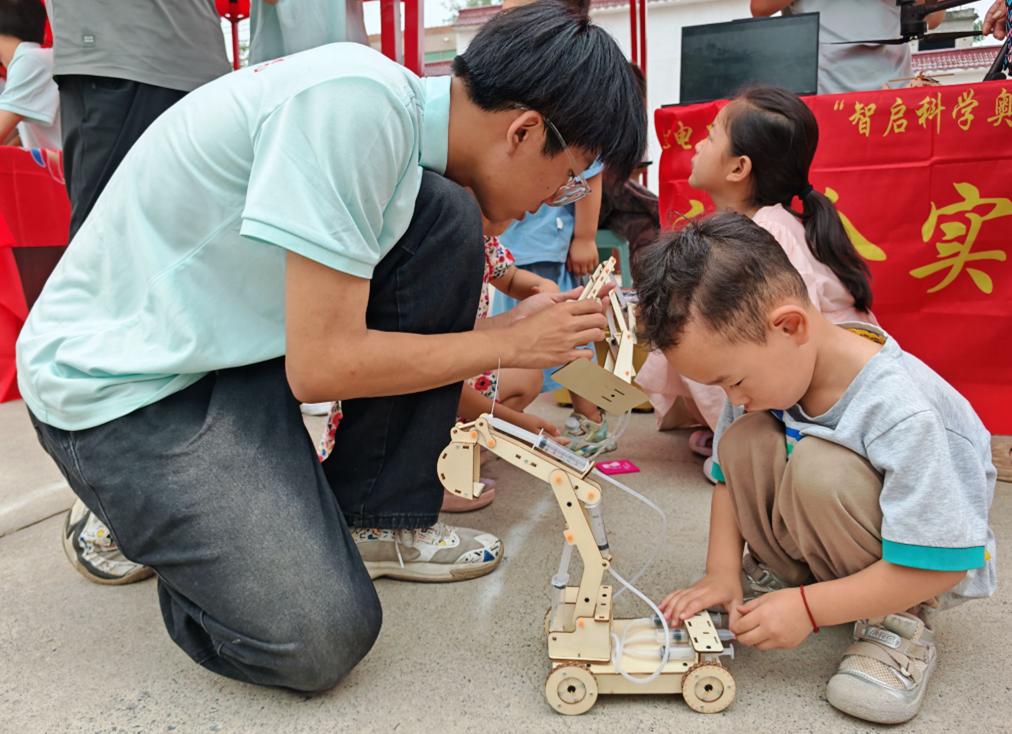 实践队员借助挖掘机模型,演示液压传动“小力撬动重物”的特性,鼓励小朋友动手操作提升科学兴趣。